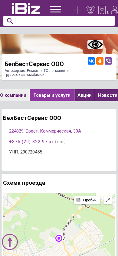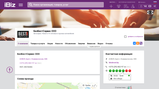 | AI-анализ | The web project "BelBestService LLC - Auto Service. Repair and Technical Maintenance for Light and Heavy Vehicles. 224029, Brest, Commercial Street, 30A" is a Belarusian business website dedicated to an auto service company offering repair and technical maintenance for both light and heavy vehicles. The website provides a map scheme for visitors to find the location, as well as contact information including a phone number and address. The company, BelBestService LLC, is located in Brest, Belarus on Commercial Street, number 30A. The business hours are listed as Monday to Saturday from 9:00 AM to 6:00 PM, with no breaks for lunch. The website also includes sections for company information, products and services, news, vacancies, videos, and customer reviews on various social media platforms. Additionally, the site offers free classified ads |