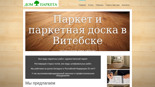 | AI-анализ | The website is a company offering various parquet services in the city of Vitsebsk, Belarus. It provides services such as parquet installation, restoration of old floors, and all types of sanding works. The company has been operating in the market of Belarus and the Russian Federation for 25 years and boasts a highly qualified workforce and professional equipment. They offer various types of parquet, including massive ones of all tree species, including exotic ones. The website also mentions various brands of parquet, such as Boen from Germany, Karellia from Finland, and Polarwood from Finland-Russia. They offer various types of plinths, plywood, underlay, adhesives, and flooring materials from brands like Bostik from France, WAKOL from Germany, and Forbo from Switzerland. They also provide lacquers, spackling, and frie |