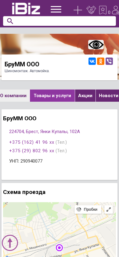 | AI-анализ | This website is the online presence for BrumM OOO, a company located in Brest, Belarus at Янки Купалы, 102A. The website offers information about the company's tire mounting and car wash services, contact details, and a map for visitors. The business is open from Monday to Sunday, 8:00 AM to 10:00 PM without breaks for lunch. The website also includes sections for company information, products and services, news, and customer reviews. The domain is registered to ООО "АЙБИЗ МЕДИА" and can be contacted via the phone numbers +375 (162) 41 96 xx and +375 (29) 802 96 xx. The company specializes in tire mounting and car wash services, as well as hym |