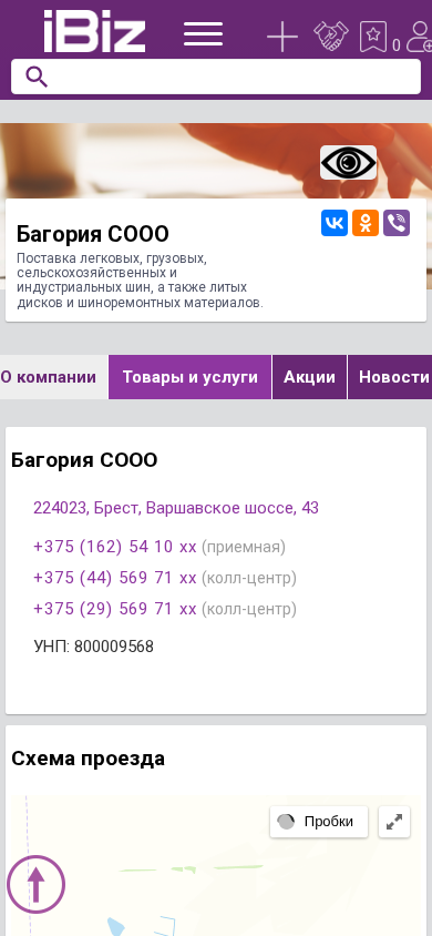 | AI-анализ | This website is an e-commerce platform for the sale and distribution of various types of tires and wheels, as well as tire repair materials. The company, named Багория СООО, is located in Brest, Belarus, at Варшавское шоссе, 43. The contact information for the company includes three phone numbers: +375 (162) 54 10 xx (reception), +375 (44) 569 71 xx (call center), and +375 (29) 569 71 xx (call center). The company offers tires for light vehicles, heavy vehicles, agricultural equipment, and industrial machinery, as well as wheels and tire repair materials. The website includes sections for news, job listings, and customer reviews on social media platforms such as VKontakte and Od |