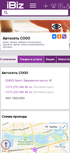 | AI-анализ | The website is an e-commerce platform for the sale of tires and wheels for various types of vehicles, including summer, winter, all-season, and cargo tires, as well as light and heavy-duty wheels. The platform provides a map and contact information for the company located in Brest, Belarus, on Varsavskoje Shosse 43. The website includes sections for company information, products and services, news, and customer reviews. The contact information includes phone numbers for a light vehicle department. The company's Unified State Register number is 190513391. The website operates from Monday to Friday, 8:30 AM to 7:00 PM, and on Saturdays, 8:30 AM to 4:00 PM, without a lunch break. The website is listed under the categories of "Automotive tires, wheels for |