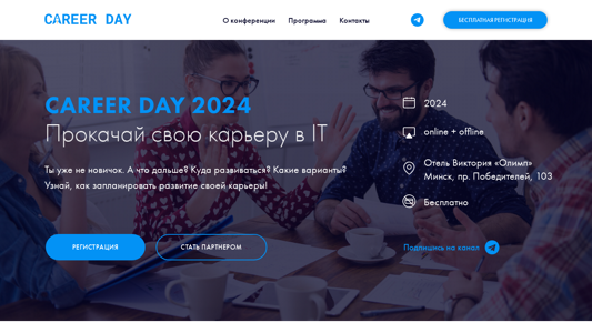The portal Career Day 2024 is an annual conference for IT specialists from Russia, Belarus, Kazakhstan, and other countries, designed to help advance their careers. The event offers opportunities for attendees to engage with industry representatives, visit booths, and ask questions to speakers. The conference covers various career development options in IT, including freelancing, starting a business, and vertical growth within companies. Speakers share their expertise and insights into current trends and challenges, helping participants understand potential career paths and learn from industry leaders. Career Day 2024 is taking place at the Hotel Victoria "Olimp" in Minsk, Belarus. Registration for attendance and partnership is free and can be done online or offline.