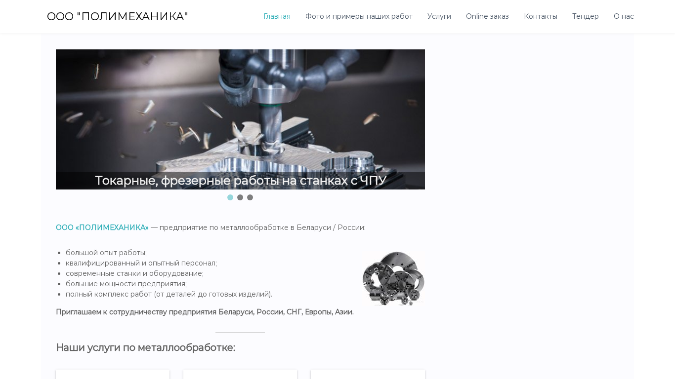 | AI-анализ | The website is for OOO "Полимеханика," a company based in Belarus and Russia specializing in metalworking. The homepage features a link to the main content, showcasing photos of their work, services, an online ordering system, contacts, a tender section, and an "About Us" page. Keywords include "деталей" (details), "работы" (works), "ооо" (OOO), "полимеханика" (Polimehanika), "работ" (works), "услуги" (services), "контакты" (contacts), "нас" (us), "токарные" (lathe), "фрезерные" (milling), "станках" (machines), "чпу" (computer numerical control), "металлообработке" (metal  |