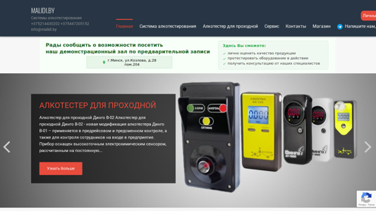 | AI-анализ | The web project MALIDI.BY focuses on alcohol testers and related services. The homepage includes sections for the company's systems of alcohol testing, a shop, and a contact form. Keywords associated with the site include "алкотестер" (alco-tester), "проходной" (proходной - checkpoint), "малиди" (company name), "узнать" (to find out), "больше" (more), "динго" (brand name), "регистрация" (registration), "технического" (technical), "обслуживания" (service), "метрологических" (metrological), "работ" (works), "аренда" (rent), "оборудования" (equipment), "b-02", "предприятие" ( |