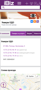 | AI-анализ | The website is for a clothing repair company named Unikum ODO, located in Poslick, Belarus, at the address Заслонова, 5. The title and description of the website mention that it offers sewing services for women's clothing. The contact information for the company includes three phone numbers, and the Unified Taxpayer Number (УНП) is listed as 300043261. The website also has a map with directions and operating hours from 9:00 AM to 6:00 PM, Monday through Friday, with Saturdays and Sundays being closed. The company specializes in sewing and offers various textiles and accessories. There are also sections for news, announcements, and vacancies, as well as links to their social media profiles. |