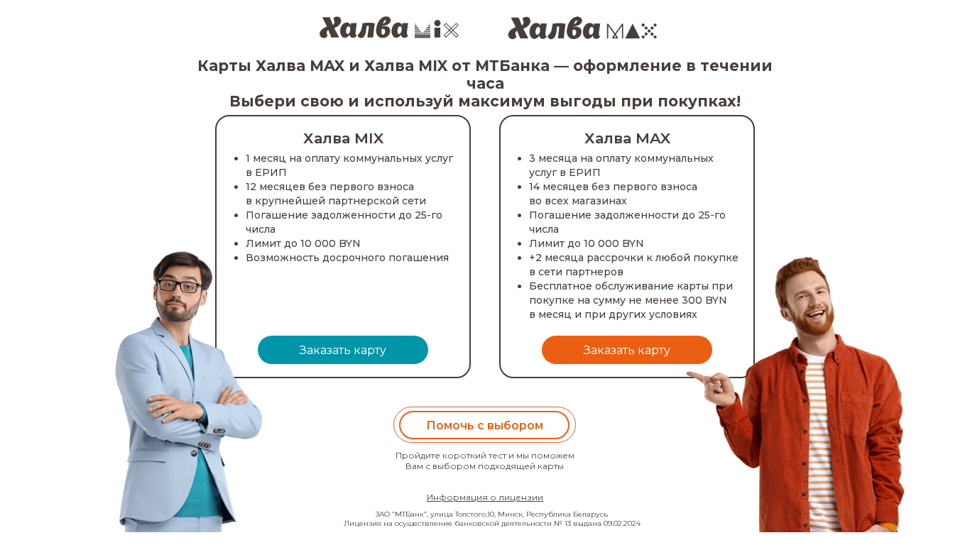 | SEO-описание | Карты Халва MAX и MIX от МТБанка лимитом до 10 000 рублей. Пользуйся больше года без первого взноса во всех магазинах. Оплачивай коммунальные услуги в ЕРИП. Досрочное погашение с карты Visa и MasterCard любого банка без комиссии. Для оформления понадобится паспорт. Даем 25000 BYN на все покупки. |