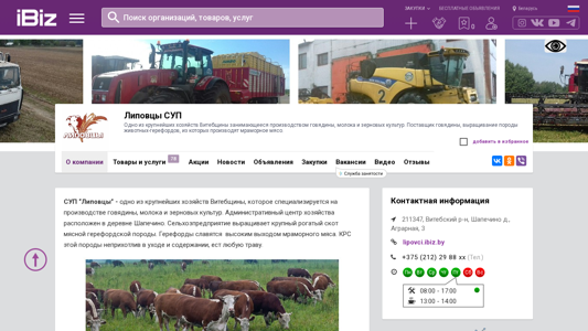 The website is for a large agricultural business called "Lipovci SUP" located in the village of Shapechino, Agrarnaya, 3, 211347, Belarus. The business specializes in the production of beef, milk, and cereal crops. They are a supplier of beef and breed gereford cattle, from which marble meat is produced. The website provides information about the company, its products and services, and includes sections for news, vacancies, and announcements for purchases. The business also engages in activities such as the cultivation of cereal crops, the breeding and raising of cattle, the breeding and raising of gereford cattle, milk production, and the cultivation of crops for feed. The company has various production brigades, machinery and tractor park, grain and vegetable storage facilities, and storage facilities for chemicals. The long-term goal