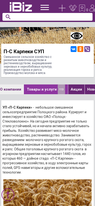 | AI-анализ | The web project "P-S Karpeki SUP" is a mixed agricultural business with a well-developed livestock and crop farming division. They grow cereals and legume crops, sell chickpeas and rapeseed. The business also produces milk and meat. Located in Belarus, at Karpeki Ag, Rechna Street, number 2. The company offers various agricultural products and services, including livestock, zernovaia kultura (cereals), maslianaia kultura (oilseeds), zernobobovaia kultura (legumes), and milk. The agricultural holding is home to a herd of 1,440 heads of large cattle, with 460 of these being milking cows. The farm uses modern technologies such as electronic field maps, GPS navigation, and other supporting tools. P-S Kar |