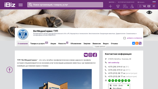 | AI-анализ | The website is a veterinary services company, "VetMediaServis TUP," located in Belarus, specifically at Chkalova 68, Vitsebsk 210039. The company offers a range of veterinary services including but not limited to: obstetrics and gynecology, anesthesiology, vaccination of animals, dermatology, and retail stores for animals and veterinary pharmacies under the name "ХАМЕЛЕОН." The website contains information about the company, its offerings, and contact details. The company specializes in providing services to all types of domestic animals using the latest scientific and technological advancements. Services provided include: obstetrics and gynecology, anesthesiology, vaccination, gastroenterology, dermatology, dietology, dispensary care, cardiology, laboratory di |