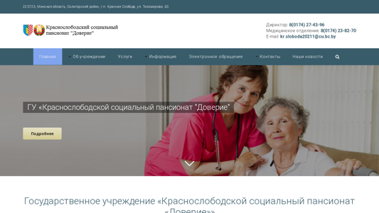 | Название / Заголовок | Государственное учреждение «Краснослободской социальный пансионат "Доверие"" - Государственное учреждение «Краснослободскойсоциальный пансионат "Доверие" |