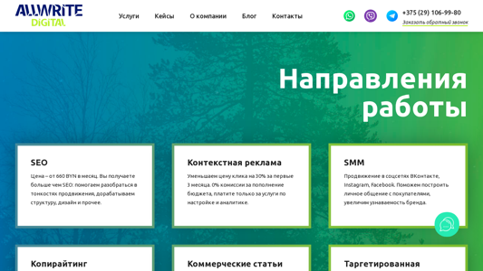 | AI-анализ | --- The portal Allwrite Digital is a certified agency for Yandex and Google based in Minsk, Belarus. It specializes in website promotion, contextual advertising, social media marketing (SMM), and copywriting with a fifteen-year track record. Services include case studies, media advertising, retargeting/remarketing, website traffic and positioning, young site promotion, one-time SEO optimization, user experience audit, SEO-audit of websites, lead generation, YouTube advertising, mobile phone advertising, search engine optimization (SEO), and content writing for websites and email newsletters. The company also offers presentation design, targeted advertising on Facebook, Instagram, VKontakte, and Odnoklassniki, commercial articles, email marketing, and SMM services with a focus on building personal relationships with customers and increasing brand awareness. Pricing starts at 660 BYN per month, offering |
