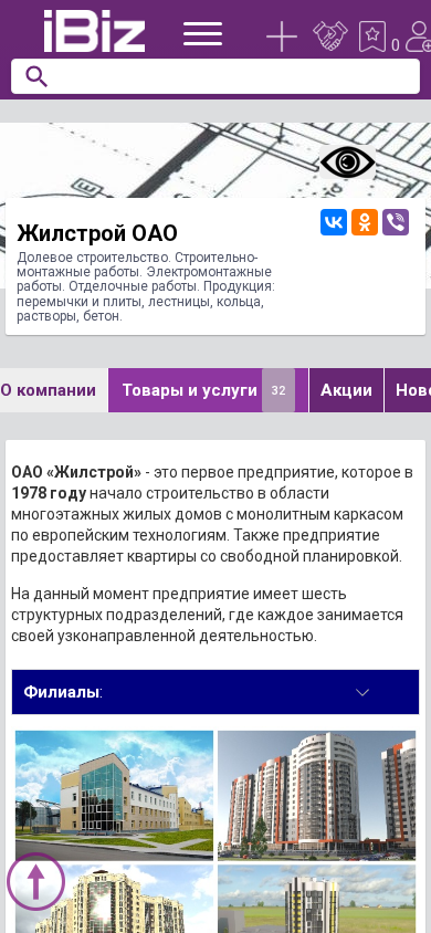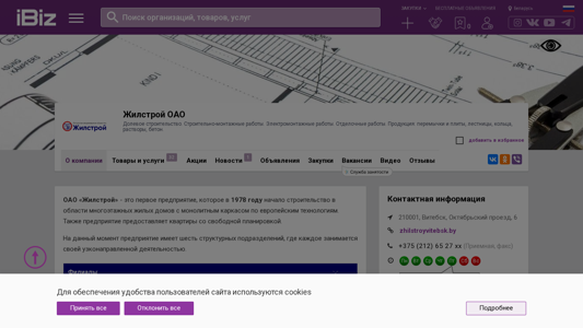 | AI-анализ | The web project "Жилстрой ОАО" is a construction company based in Vitsebsk, Belarus, at Октябрьский проезд, 6. The company specializes in collective housing construction using monolithic frameworks based on European technologies. Its product range includes fittings and plates, ladders, rings, concrete, and cement. The company offers building, installation, electrical installation, and finishing services. The website provides information on the company's background, its six structural divisions, and the modern and comfortable housing solutions it provides with customizable living space planning. The company has a reputation for competitive pricing and has made significant contributions to the development of Vitsebsk and the region. |