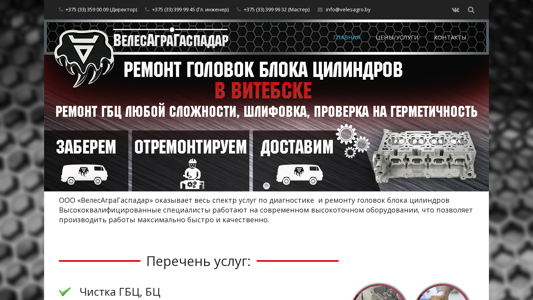 | AI-анализ | This online resource is the official website of OOO "VelesAgraGaspadar," a company based in Vitebsk, Belarus, which offers services related to the repair of head gaskets (ГБЦ) and blocks of cylinders. The homepage displays a menu with options for 'Main,' 'Prices/Services,' 'Contacts,' and a contact phone number and email address. The company specializes in providing high-quality repair services using skilled professionals and advanced equipment. The listed services include cleaning, testing, deficiency diagnosis, and restoration work for both head gaskets and cylinder blocks. The website also mentions benefits such as quick turnaround, qualified specialists, modern equipment, competitive pricing, cash and non-cash payment options, and pick-up and delivery services. The company's address is given as ul. Michurina, d. 5 in Vite |