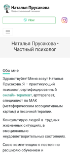 | AI-анализ | --- The portal is run by Natalia Pruasikova, a practicing private psychologist certified in online therapy, art therapy, and meta associative card therapy, as well as a sand therapy specialist. She provides individual consultations for adults facing various challenges and emotional distress. Her competence is continuously expanded through education and qualification improvement in various psychology fields. During sessions, she employs emotional-imagery therapy, elements of art therapy and coaching, NLP techniques, and metaphoric associative cards, among others. The methods and approaches include an individual approach to each client, client-centered therapy, analytical-practical approach, existential-humanistic approach, ecofacilitation, and coaching, among others. The services offered include individual consultations for adults, consoling couples, and online sessions. Prices start at 48 euros for a one-hour consultation. The portal is |