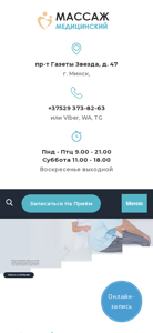 | AI-анализ | --- This online resource is a medical massage clinic website based in Minsk, Belarus. The title of the website is "Медицинский массаж, Массажный кабинет в Минске" which translates to "Medical Massage, Massage Cabinet in Minsk." The description provides information about various types of massages available, including professional massage services and ozone therapeutic massage. The contact information includes a phone number, Viber, WhatsApp, and Telegram for making appointments. The website is open for business Monday through Saturday from 9:00 AM to 9:00 PM, and on Sundays from 11:00 AM to 6:00 PM. The menu includes sections for specialists, services, types of massage, and contact information. The website offers massages for various conditions such as osteochondros |