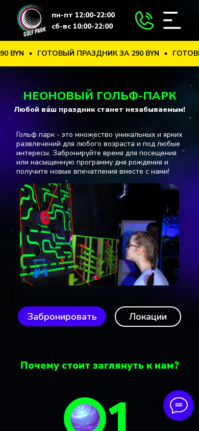 | SEO-описание | Гольф-парк - яркая локация для семьи, друзей и проведения дней рождений в неповторимой неоновой атмосфере. Разнообразие локаций - неоновый мини-гольф, сухой бассейн, виртуальная реальность, более 10 игровых автоматов обеспечат новые впечатления |