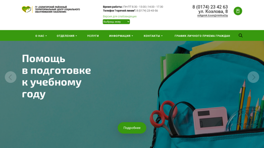 | AI-анализ | This website belongs to the "Soligorsky District Territorial Social Services Center for the Population" in Belarus. The organization provides various social services, including primary reception, analysis, and information, complex support in crisis situations, social assistance at home, social rehabilitation and ability enhancement for people with disabilities, and day care for the elderly. The center also offers information, contacts, and services related to multiple children, material assistance from the Social Security Fund, active aging, legal basis, humanitarian projects, lifelong pension contracts, replacement families, and prevention of domestic violence. The website includes sections for news, useful articles, announcements, and anti-corruption efforts. The contact information includes a hotline phone number and an address in Soligorsk. The website is accessible at socialsoligorsk.by. |