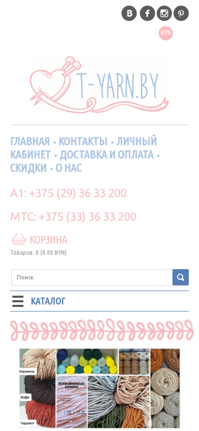 | SEO-описание | T-Yarn.by - вязание от слов к делу - здесь ВЫГОДНЫЕ цены ждут Вас каждый день, а не только на акциях ВСЕГДА в наличии трикотажная пряжа, полиэфирный, гамаковый и хлопковый шнур, рафия, джут, нити для вязания, пряжа для вязания одежды и аксессуаров БЫСТРО обрабатываем заказы, советуем и помогаем НЕТ минимального заказа |