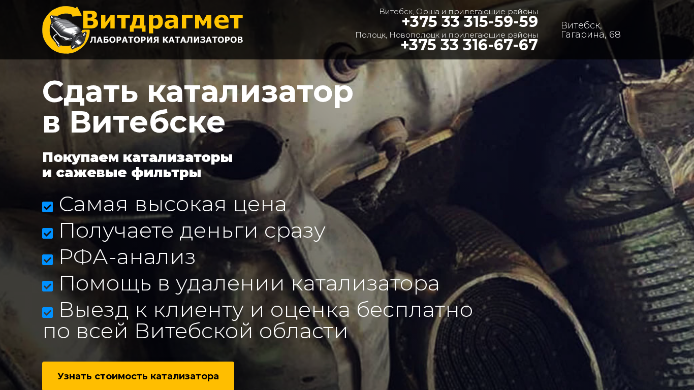 | Ключевые слова | Сдать катализатор в Витебске дорого. Цены выше общегородских. Наличные деньги всего за несколько минут. Покупка сажевых фильтров |