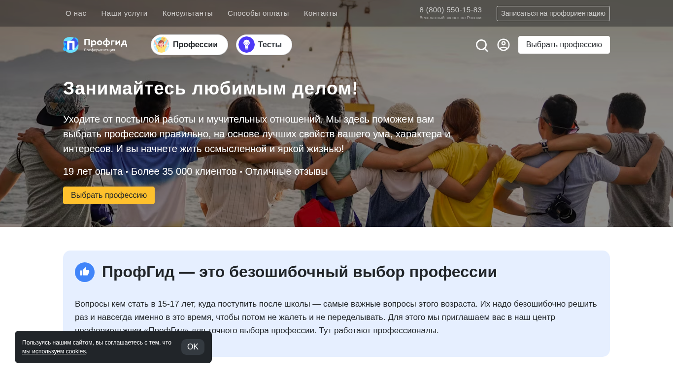 | SEO-описание | Начните жить осмысленной и яркой жизнью! Поможем выбрать профессию на основе лучших свойств вашего ума, характера и интересов. |
