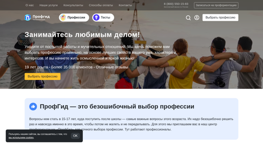 | AI-анализ | The portal ProfGid is a consultancy and testing service for children and adults, helping them choose a profession based on their cognitive abilities, character traits, and interests. With over 19 years of experience and more than 35,000 clients, ProfGid offers personalized consultations and a variety of tests to determine the best-suited careers. The website provides information on various professions, their requirements, and the process of applying to universities or colleges in Russia and abroad. The ProfGid team consists of professionals who aim to assist individuals in making informed decisions about their future careers. The website offers both online and offline consultations, with a one-time fee for a two-hour session. ProfGid caters to clients from various countries, including Russia, Canada, China, Kazakhstan, the USA, Ukraine, Belarus, France, and the UK. |