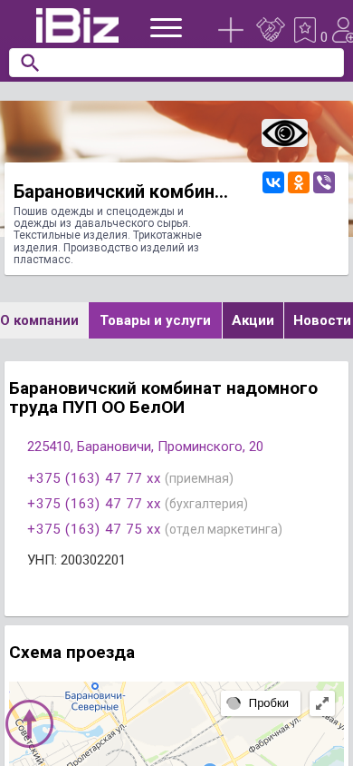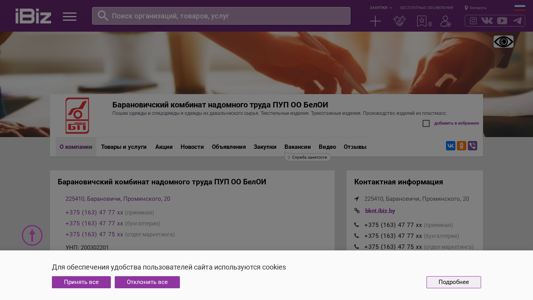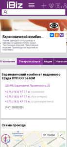 | AI-анализ | This online resource is a website for Baranovichsky Combine of Homework PUP OO BelOI, which specializes in the sewing of clothes, workwear, and clothing from donated raw materials. The website offers textile and knitted goods, as well as plastic products. The website provides contact information, including phone numbers for the reception, accounting, and marketing departments. The company's UNP number is 200302201. The website also includes a map scheme and business hours, which are from 9:00 to 18:00, Monday through Friday, with no lunch break. The company is located in Baranovichi, Prominiskaya Street, number 20. |