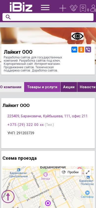 | SEO-описание | Лайкит ООО - Разработка сайтов для государственных компаний. Разработка сайтов под ключ. Корпоративный сайт. Интернет-магазин. Продвижение сайтов. Техническая поддержка сайтов. Доработка сайтов.. Схема проезда, контактные телефоны, адрес компании Лайкит ООО. 225409, Барановичи, , Куйбышева, 111, офис 211 |