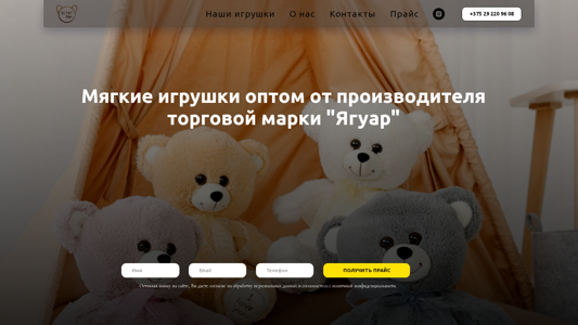 | AI-анализ | This website is an e-commerce platform for soft toys sold wholesale by the manufacturer under the brand "Ягуар." The site provides information about the company, its products, and contact details. Visitors can place orders and request a price list by leaving a request on the site, contacting the manager via phone +375 29 220 96 08, or sending an email to jaguar-toy@yandex.by. The site offers various soft toys such as bears, rabbits, cats, dogs, unicorns, monkeys, and more, which can be viewed in the gallery section. The site also mentions a vacuuming and packaging process before delivery. Free delivery is offered for orders in Belarus through the transport company "Автолайтэкспресс," and in Russia, free delivery is provided up to a transport company in Moscow |