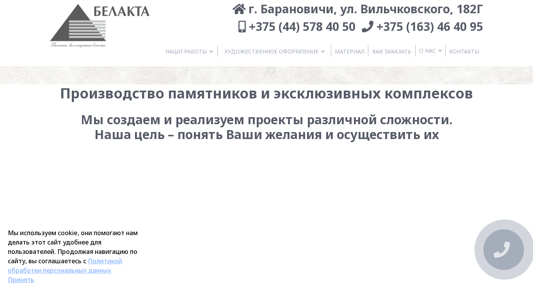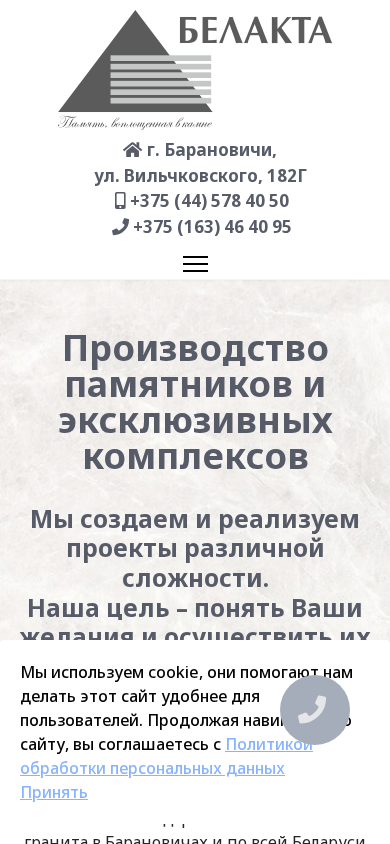 | AI-анализ | language: ru  This online resource is dedicated to the production and sale of memorials and memorial complexes in Baranovichy, Belarus. The website offers a range of monuments from simple to exclusive, with affordable prices. The company, Belakta, has been in operation since 2007 and specializes in the professional manufacturing of granite memorials and complexes throughout Belarus. Their team of experts has undergone professional training and certification on advanced equipment from Scandinvent (Sweden), Intermac (Italy), Nuova Mondial Mec. (Italy), and Monstal (Poland). The company boasts a modern and advanced park of CNC machines for stone processing in Belarus. The inventory system enables them to offer competitive prices while maintaining quality. The materials used are from reputable Russian and international suppliers, with certifications confirming their quality and origin. Cl |