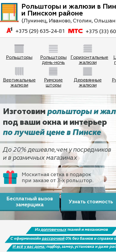 | AI-анализ | The portal jalusipinsk.by offers rollshutters and jalousie in Pinsk for purchase. Rollshutters and jalousie in Pinsk and the Pinsk region (Luniнеc, Ivanovo, Stolin, Olshany) include free measurement, delivery, and installation. Phone numbers for inquiries are provided from 9:00 to 22:00 daily. Rollshutters include day-and-night options, horizontal jalousie, plyssé curtains, vertical jalousie, Roman curtains, wooden jalousie, roll-ups, and custom-made rollshutters and jalousie for windows and interiors at the best price in Pinsk. Save up to 20% compared to intermediaries and retail stores. A mosquito net is included as a gift with orders of three |