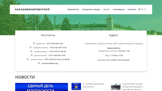| AI-анализ | This website belongs to УКРСП «Барановичиремстрой» (BARANOVICHIREMSTROY), a construction company based in Baranovichy, Belarus. The address is given as ul.Brestskaya 297a, 225413, Brestskaya oblast, Belarus. The company can be reached by phone at +375 (163) 61-89-84. The title of the website is "УКРСП «Барановичиремстрой»" and the description includes information about the company's history, its main activities, and contact details for various departments, including a reception email address (reception@barst.by). The company was established in 1944 as a repair and construction organization and has |