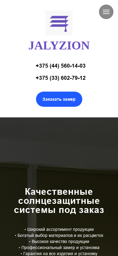 | AI-анализ | --- The portal JALYZION is an e-commerce website specializing in the sale of roll-shutters, sun protection systems, and Roman blinds. It offers custom-made products with over 100 variations of fabric for roll-shutters and blinds. The website provides discounts for both new and returning customers and offers financing. The main content includes sections for products, about the company, examples of work, news, and promotions, and contacts. The website emphasizes high-quality products, professional measurement and installation, a guarantee on all items and installation, and personalized service. Visitors can place a free consultation request and receive a catalog of materials from a master. The website also highlights a wide selection of designs and materials, excellent product quality, and a personalized approach to customer requests. |