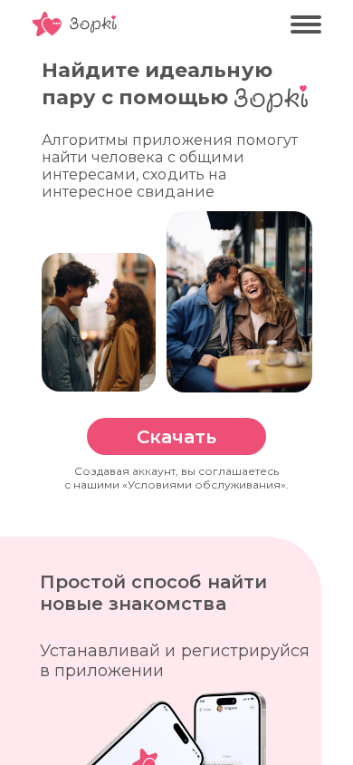 | AI-анализ | The website Zorki is a dating application for partners. Users can register and install the app to find potential matches based on shared interests, ensuring a more enjoyable and successful dating experience. The application features an easy-to-use interface for finding new acquaintances and partners, with a focus on safety and security. User profiles are verified to prevent unwanted contacts, and the app offers recommendations for ideal dating locations. Users must agree to the terms of service and privacy policy upon registration. Additionally, partners can place advertisements on the platform. |