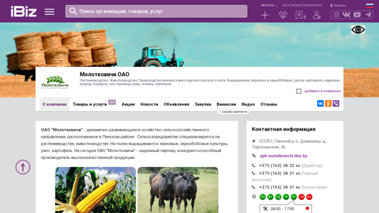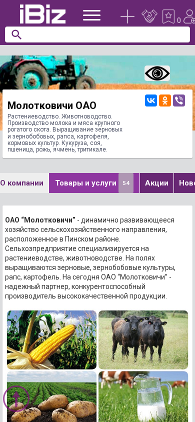 Название / Заголовок | Молотковичи ОАО - Растениеводство. Животноводство. Производство молока и мяса крупного рогатого скота. Выращивание зерновых и зернобобовых, рапса, картофеля, кормовых культур. Кукуруза, соя, пшеница, рожь, ячмень, тритикале.. 225767, , Домашицы д., Партизанская, 2Б |