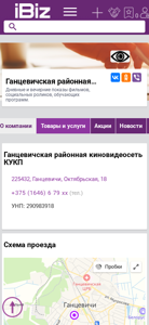 | AI-анализ | This website is the official page for the Ganzevich Regional Cinema and Video Network KUKP in Belarus. It provides information about daily and evening showings of films, social videos, and educational programs. The address and contact information for the company, including a phone number and map, are also included. The website offers a range of services, such as movie tickets, and features sections for news, announcements, vacancies, and customer reviews on social media platforms. The website is primarily focused on the cinema industry and is located in the city of Ganzevichi, Octyabrskaya Street 18. The company's Unified State Register number is 290983918. The website operates from Monday to Friday, 9:00am to 6:00pm, without lunch breaks. Weekends are closed. The contact person is Victoria Aleks |