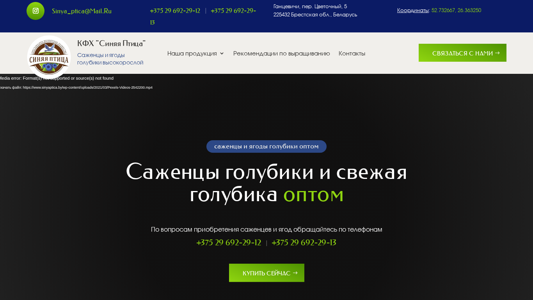 | AI-анализ | This website is a Belarusian farm named "Синяя Птица" (Blue Bird) that offers the sale of blueberry bushes and blueberries in bulk. The farm specializes in two- and three-year-old blueberry saplings with a closed root system. The farm's location is in Ganцевичи, along the Cvetochny Street, in the Brest Oblast, Belarus. The contacts provided are three phone numbers and two email addresses. The farm's main products include blueberry saplings and fresh blueberries. The website also offers recommendations for blueberry cultivation. There is a video player and an option to download a video file, but the format is not supported. The farm's mission is to provide the best price for blueberry saplings and fresh blueberries, with free shipping to Russia and Kazakhstan. |