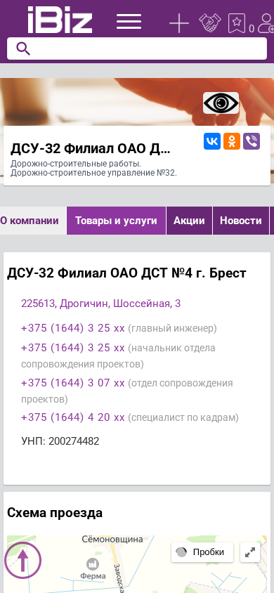 | Название / Заголовок | ДСУ-32 Филиал ОАО ДСТ №4 г. Брест - Дорожно-строительные работы. Дорожно-строительное управление №32.. 225613, Дрогичин, , Шоссейная, 3 |