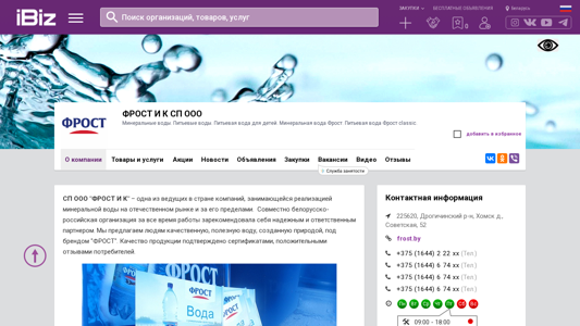 | AI-анализ | The portal is a Belarusian company, ФРОСТ И К СП ООО, specializing in the sale of mineral waters and drinking waters. The company offers mineral water under the FROST brand, including a children's version. The website provides information on the company, its products, and contact details, including address, phone numbers, and a map for easy location. The company, which has a Belarusian-Russian partnership, has built a reputation as a reliable and responsible business partner. They offer mineral waters, drinking waters, and bottled water with custom logos. The water is sourced from an ecologically clean area near Brest, from wells at depths of 195, 283, and 285 meters. The company's products are available not only in Belarus but also in stores in Russia, the Baltics, and Poland. |