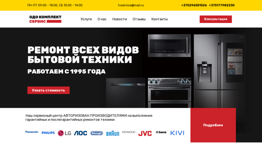| AI-анализ | This website is for ОДО Комплект сервис, a service center for repairing various household appliances. The title is "Главная" (Home), and the description includes keywords related to repair, household items, services, and contacts. The top words include repair (69 times), appliances (12 times), services (11 times), and contacts (7 times). The website provides contacts for TVservice@mail.ru and three phone numbers, as well as information about services, the company, news, reviews, and consultations. The website offers repair services for televisions, monitors, fax machines, washing machines, dishwashers, kitchen appliances, irons, blenders, breadmakers, coffee machines, multicookers, refrigerators, vacuum cleaners, microwave ovens, duct hoods, valve panels, and more. The website also offers |