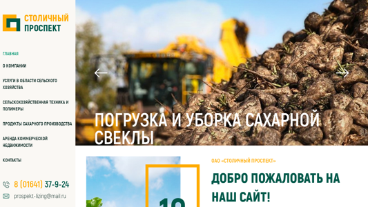 --- The website is for OAO 'СТОЛИЧНЫЙ ПРОСПЕКТ', offering services and products in the agricultural sector, including sugar beet farming. The company provides technology and high-quality products, aiming to help farmers expand their possibilities. The website includes information about the company's 10-year history, efficient technologies, and various services such as sugar beet harvesting and loading. Visitors can find news and press releases, as well as contact information for the company located in Belarus. The domain is registered as 'prospekt-lizing.by'.