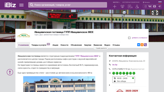Название / Заголовок | Ивацевичская гостиница ГУПП Ивацевичское ЖКХ - Одно-, двух-, трехместные номера и номера люкс.. 225295, Ивацевичи, , Комсомольская, 23 |