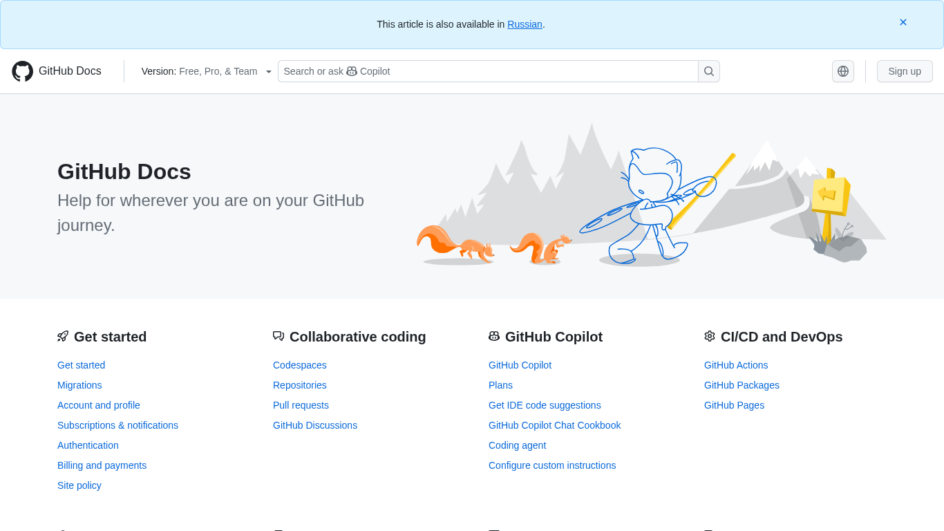 | AI-анализ | language: en The portal GitHub Docs is a comprehensive resource for users, developers, administrators, and all other GitHub product users. The site offers documentation on how to get started, troubleshoot issues, and make the most of GitHub's features. With a focus on providing clear and concise information, GitHub Docs covers a wide range of topics, from account and profile management to collaborative coding and project management. The site includes sections on GitHub's products, such as repositories, pull requests, GitHub Discussions, GitHub Copilot, and security features. Additionally, GitHub Docs provides information on various GitHub tools, including the GitHub CLI, GitHub Desktop, and GitHub Mobile. The site is available in multiple languages and includes a search function for easy access to information. GitHub Docs also features a Copilot tool for quick answers to |
