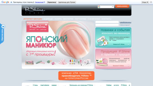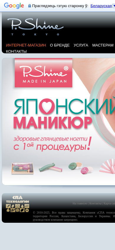 | SEO-описание | P.Shine - японский эко-маникюр и эко-педикюр (P-Shine, Pshine, П-Шайн, Пи Шайн, Пи-Шайн) Официальный сайт P.Shine в России. Сайт эксклюзивного дистрибьютора продукции для японского маникюра и педикюра P.Shine в России и странах СНГ: интернет магазин, продукция, об услугах, обучение, салоны, партнеры. |
