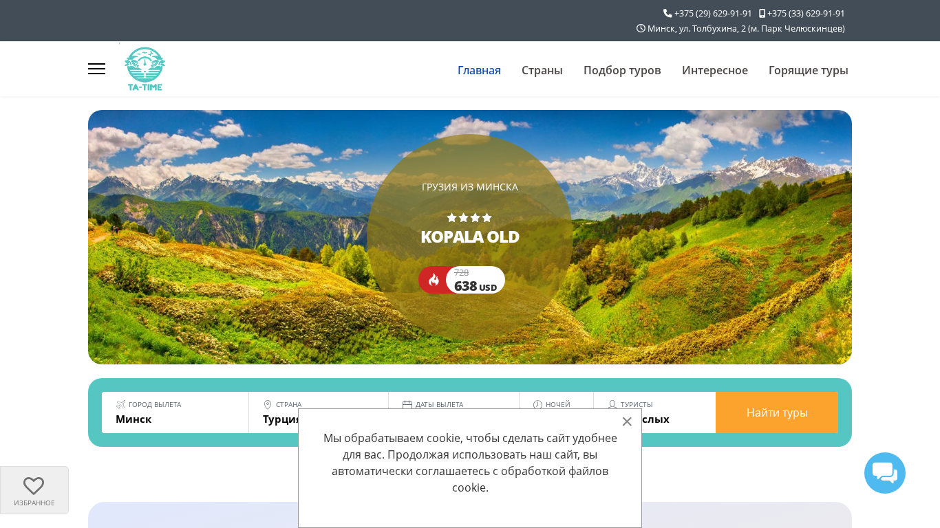 | AI-анализ | --- This online resource is a travel agency website named ta-time.by. The description tag indicates "Туристическое агентство ta-time.by" (Tourist Agency ta-time.by). The top keywords include 'usd', 'eur', 'minsk', '375', 'грузия' (Georgia), phone numbers '+375 (29) 629-91-91' and '+375 (33) 629-91-91', and addresses in Minsk, Belarus. The homepage offers a selection of tours to various countries, including Georgia, Qatar, Turkey, and Egypt, with prices listed in USD and EUR. The website also provides information on the number of travelers and duration of stays. The top destinations listed are Georgia, Qatar, Turkey |