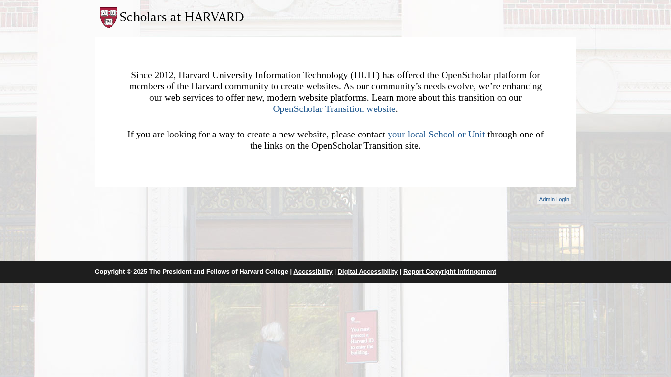 | AI-анализ | This website is part of the Harvard University network and offers personal websites created by Harvard scholars using OpenScholar@Harvard, a web publishing service provided by Harvard Web Publishing. The site has been in operation since 2012 and allows scholars to create academic websites with features such as CVs, bios, publications, blogs, announcements, links, events, image galleries, class materials, presentations, and easy submission to academic indices. The user-friendly interface requires no technical knowledge or special software, and users can edit their sites from any computer with an internet connection. The site also offers category tagging, collaborative features, and the ability to use custom domains. |
