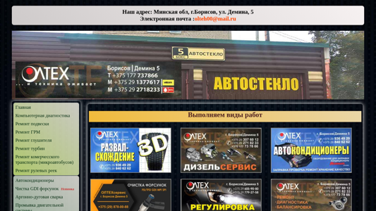 | AI-анализ | This online resource is dedicated to the automobile repair and diagnostics service 'Олтех' located in Borisov, Belarus. The website provides information about the offered services which include computer diagnostics and repair of various automobile systems, such as suspension, engine, exhaust, turbo, commercial transport, steering, air conditioning, and brake systems. The address and contact email are provided, with the location being in the Minskaya oblast, Borisov, Ul. Demina, 5. The site also mentions the availability of car condensers cleaning, Argon-arc welding, engine system washing, and diesel services. Additionally, there is a mention of car headlight and tail light polishing, brake system servicing with ABS, hydraulic press, and a car evacuator for assistance. The website also includes a 'About Us' section and is |