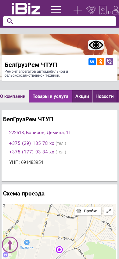 | Название / Заголовок | БелГрузРем ЧТУП - Ремонт агрегатов автомобильной и сельскохозяйственной техники. . 222518, Борисов, , Демина, 11 |