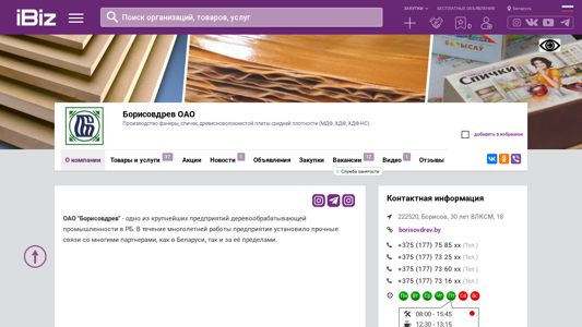 | AI-анализ | The website is for Borisovdrev OAO, a Belarusian company specializing in the production of medium density fiberboard (MDF), chipboard, and hardboard (HDF and HDF-NS). The website includes a map for directions, contact information, and the address of Borisovdrev OAO in Borisov. The company has been in operation for 30 years and offers various products and services related to wood processing, including furniture, OSB, plywood, and spruce boards. Borisovdrev OAO exports its products to countries near and far, with shipments made via both automobile and railway transport. The company has undergone significant modernization to maintain high-quality production and meet market demand, resulting in increased output and export potential. Borisovdrev OAO is a leading player in the Belarusian wood processing |