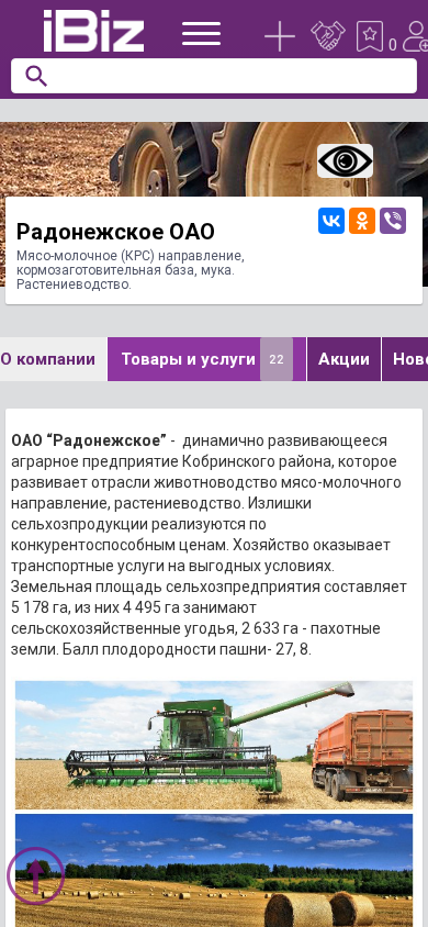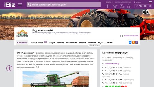 | AI-анализ | The web project "Radonezhskoe OAO" is a dynamic agricultural enterprise based in the Cobriniskaya region of Belarus. It focuses on developing the livestock sector, specifically the miaso-molochnoe (dairy and livestock) branch, as well as rastenievodstvo (agriculture). The enterprise offers competitive pricing for surplus agricultural produce and provides transport services. The total land area of the farm is 5,178 ha, with 4,495 ha dedicated to agricultural land and 2,633 ha for arable land. The farm produces and sells milk from KRS livestock, beef, zernovye (grain) cultures, maslichnye (oilseed) cultures, multileterie travy (perennial grasses), and korмоvye kultury (feed |