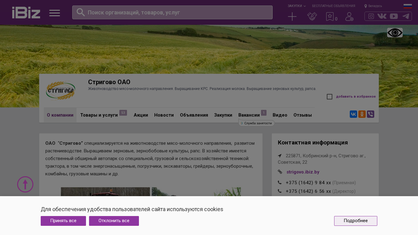 Название / Заголовок | Стригово ОАО - Животноводство мясо-молочного направления. Выращивание КРС. Реализация молока. Выращивание зерновых культур, рапса.. 225871, , Стригово аг., Советская, 22 |